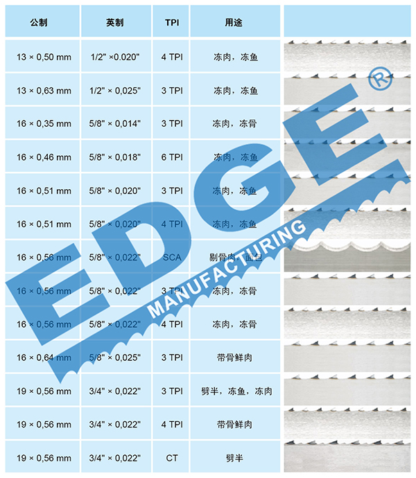 查維斯機械鋸骨機鋸條廣泛適用于大、中型水產加工企業,肉類加工企業,雞鴨魚類加工廠,加工排骨,牛扒,凍魚,凍蟹等。如超市,肉販分切小賣,飯店、餐廳中央廚房,配菜物流中心等生鮮冷凍魚肉品的分切割使用。鋸骨機鋸條能快速切割凍肉、凍魚、帶骨肉類以及畜體劈半等,符合相關國家及國際食品衛生要求。